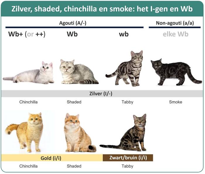 Het zilver-gen (I) is dominant over niet-zilver (i). Een (I/i) zilver kat kan zowel zilveren als bruine kittens als nageslacht hebben. Een (I/I) zilver kat brengt alleen maar zilveren kittens voort. Het zilver-gen kan tot op heden nog niet getest worden en daarom kan alleen op basis van voortgebrachte nestjes worden vastgesteld of een kat I/i is (als er ooit wel een bruin kitten bij een nestje zit) of vermoedelijk I/I is (als er altijd alleen maar zilveren kittens bij zitten). Hieronder zijn voorbeelden te zien van het zilver en gold chinchilla-, shaded-, tabby- en smoke-effect voor een brits korthaar.